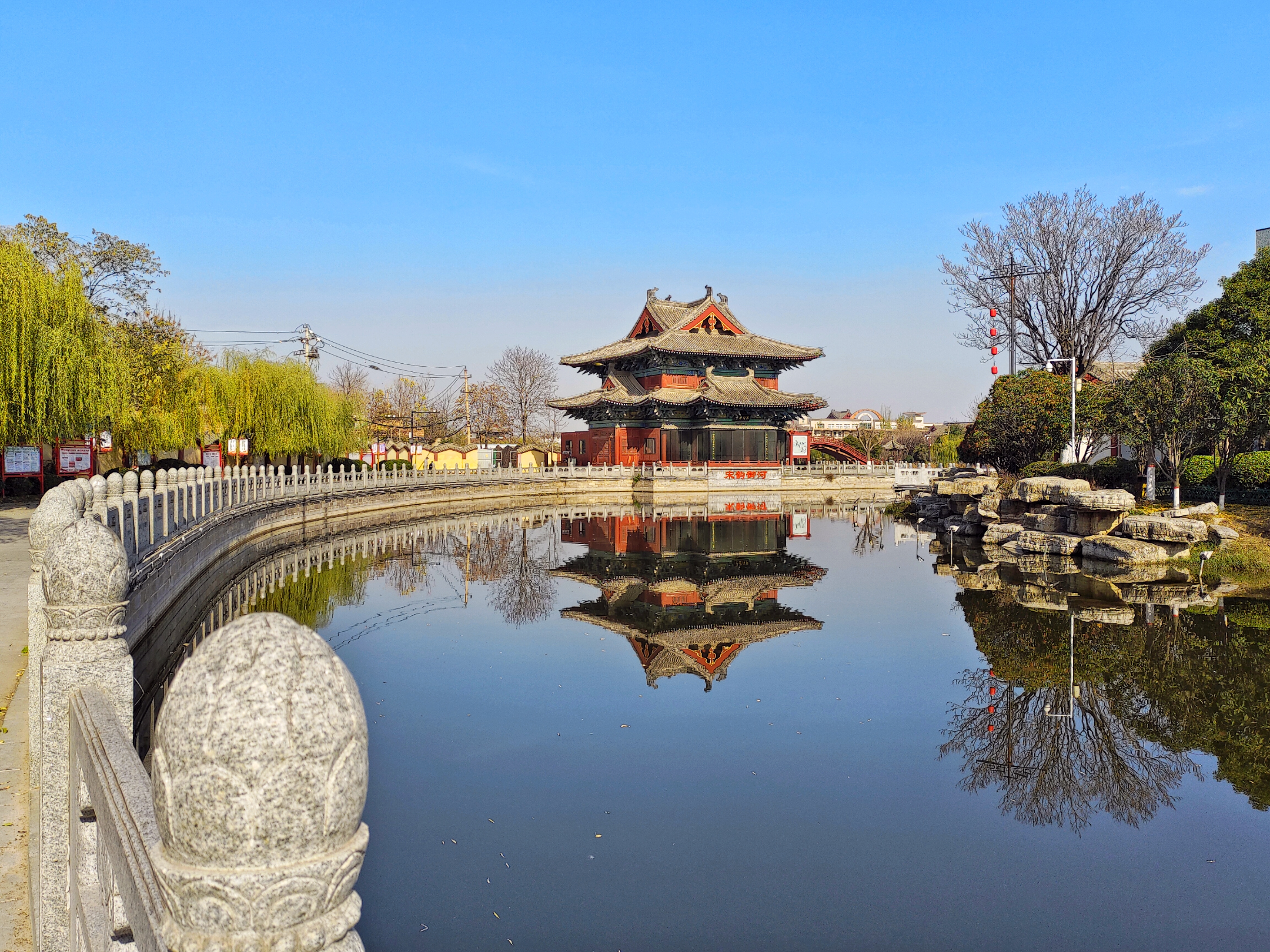 12月1日,开封市天气放晴,阳光灿烂,蓝天白云把御河景色衬托得更加美丽,不少市民趁着中午的暖阳在此散步,享受冬日里的一丝暖意。全媒体记者 李浩 摄