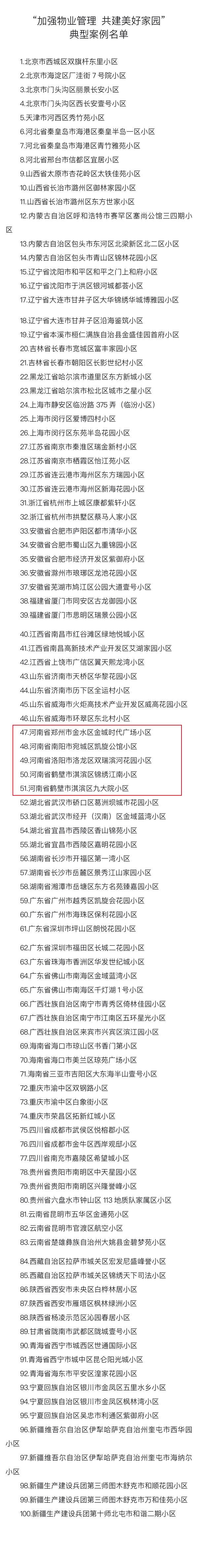 大河网讯(记者 何山)日前,住房和城乡建设部办公厅、中央文明办秘书局下发通知,公布“加强物业管理 共建美好家园”典型案例100例,河南省5个典型案例入选,分别为郑州市金水区金城时代广场小区、南阳市宛城区凯旋公馆小区、洛阳市洛龙区双瑞滨河花园小区、鹤壁市淇滨区锦绣江南小区、鹤壁市淇滨区九大院小区。