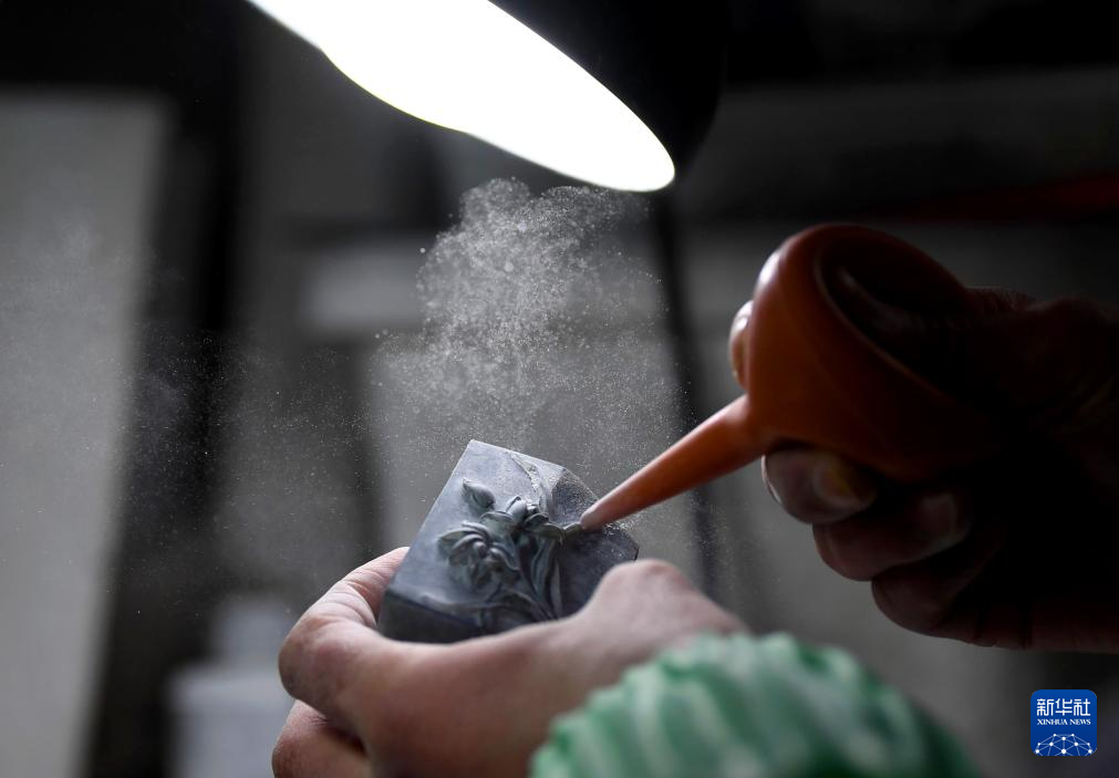 3月12日,河南省南阳市镇平县玉雕大师创意园一家工作室内,一名玉雕工作者在雕刻玉器。新华社记者 郝源 摄