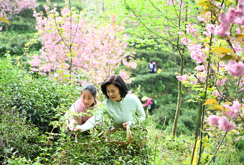 4月5日,信阳市新县春意正酣。在香山湖旁的草木人生态茶园,漫山茶树青翠欲滴,层层叠叠的茶垄沿着山势起伏,宛如一片绿色的海洋。茶园间,一树树樱花悄然绽放,粉白的花瓣随风轻舞,落英与嫩芽相映成趣。山风拂过,茶香与花香交织弥漫,沁人心脾。三五成群的茶农与游客穿梭茶山,指尖灵巧地掠过茶枝,将春天第一缕鲜香“抢鲜”采下。